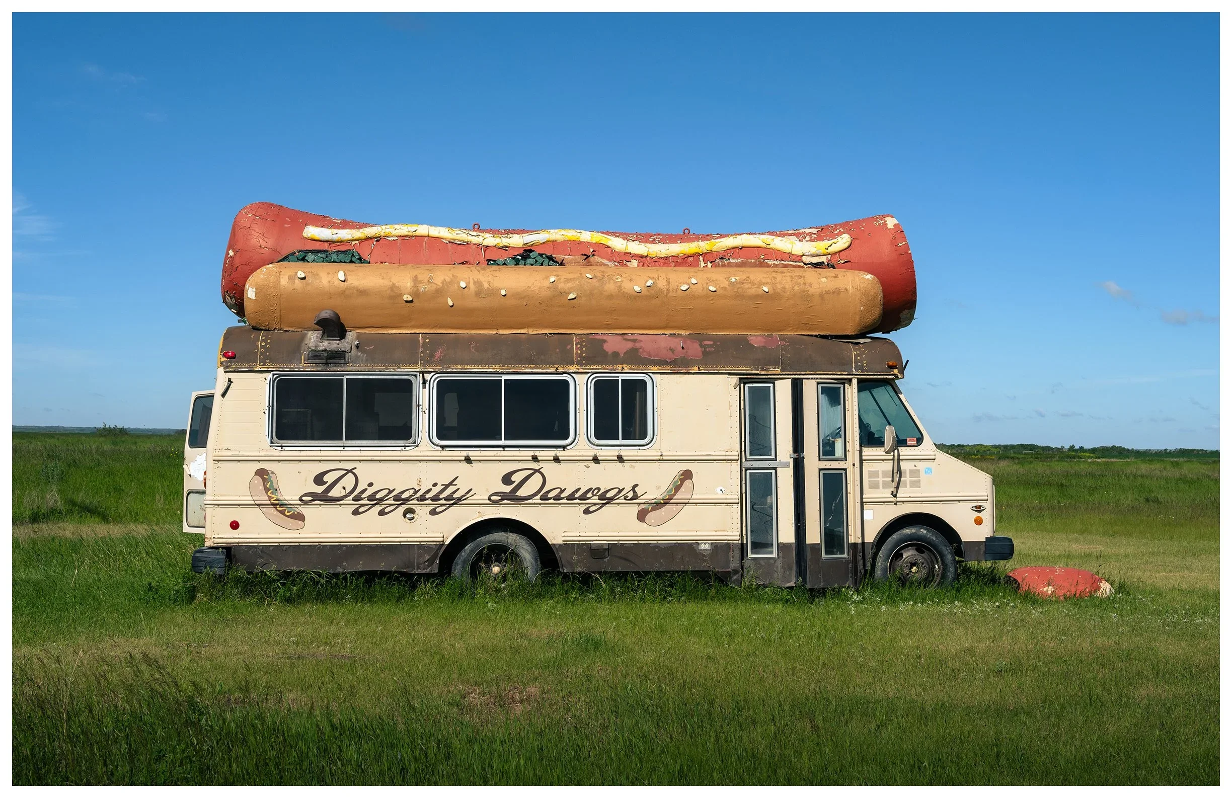 After he sold it, the Diggity Dawg bounced around. Someone tried to make it a business again but couldn’t get the permits. Then it wound up on a reservation, serving as a tour bus for a metal band. Eventually, it was parked beside that field where I found it — sunburned, pocked with bullet holes, and weather-beaten by Saskatchewan wind.